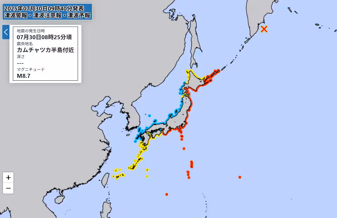 目前北海道太平洋沿岸東部與中部已經確認第一波海嘯抵達,西部地區也預測正在到達中。青森、岩手、宮城及福島等東北各縣同樣面臨海嘯威脅。關東地區包含茨城、千葉、相模灣等地區也都在警戒範圍內,預計小笠原諸島、靜岡、愛知、三重及和歌山等地區將在當地時間11時30分迎來海嘯。