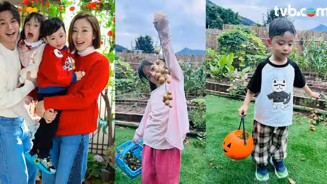 事後他在社交平台分享了照片:女兒"小珍珠"和弟弟Eden專注採摘,小珍珠還得意展示"戰利品";楊茜堯戴著遮陽帽蹲著幫孩子整理;子溢則負責爬梯剪枝,全家分工合作其樂融融。