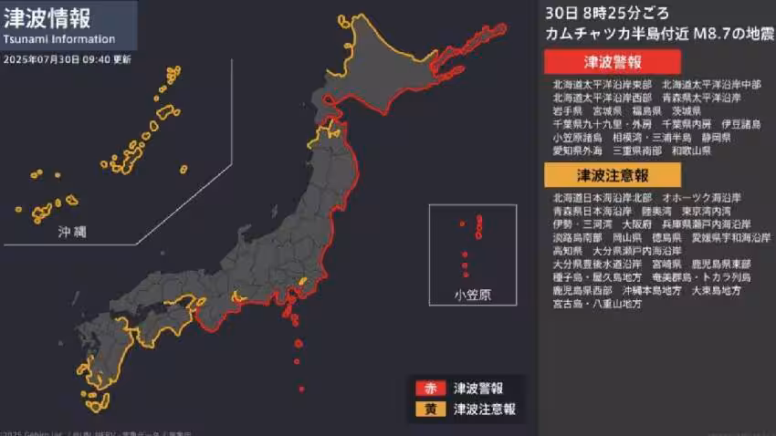 俄羅斯遠東堪察加半島外海今(30)日上午發生規模8.8的強震,日本氣象廳也對北海道至和歌山太平洋沿岸發布海嘯警報,要求民眾立刻避難。