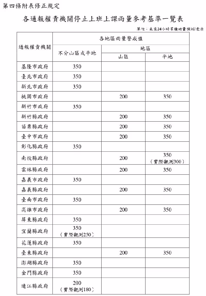 依照現行「天然災害停止上班及上課作業辦法」規定,山區累積雨量若達200毫米,或平地達350毫米時(部分縣市采統一350毫米標準),且已造成災情或有致災可能,地方政府可依實際觀測或預報結果發布停班停課通知。