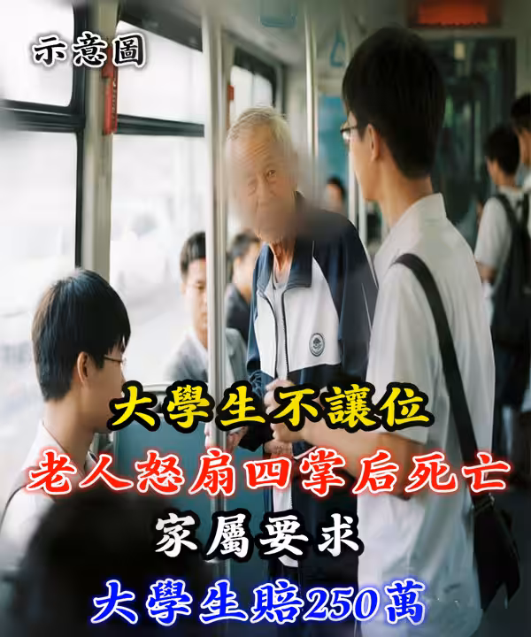 大學生不讓位,老人「怒搧四掌」後心臟病死亡 家屬要求大學生賠250萬...