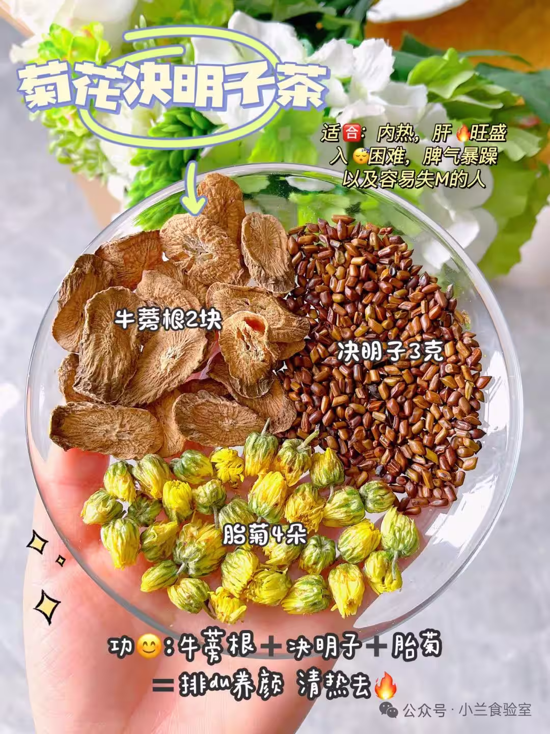 1. 準備食材:稱量牛蒡根2塊、決明子3克、胎菊4朵。牛蒡根可切片以利泡製。