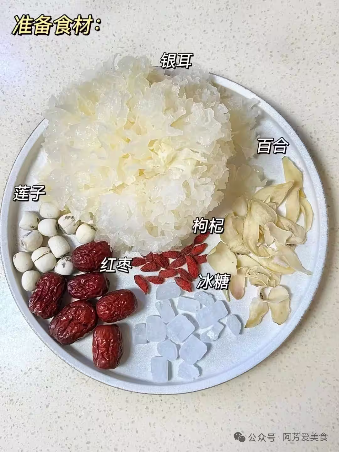 食材:銀耳半朵,蓮子一小把,紅棗幾顆,枸杞一小撮,冰糖適量,鮮百合幾瓣(可選)。