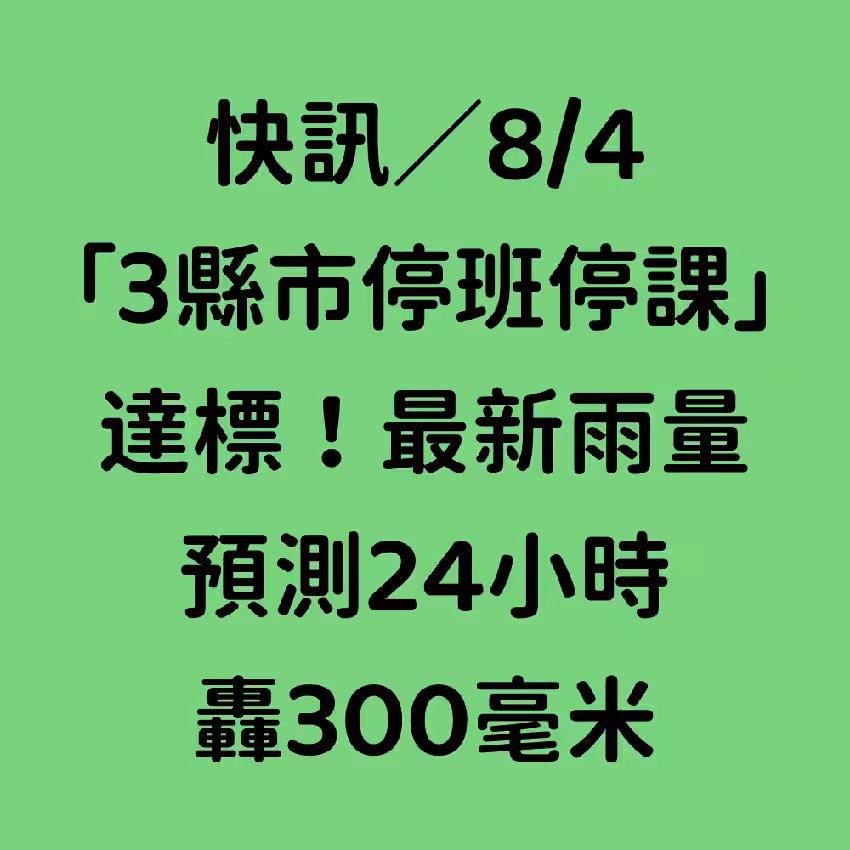 快訊/8/4「3縣市停班停課」達標!最新雨量預測,24小時轟300毫米