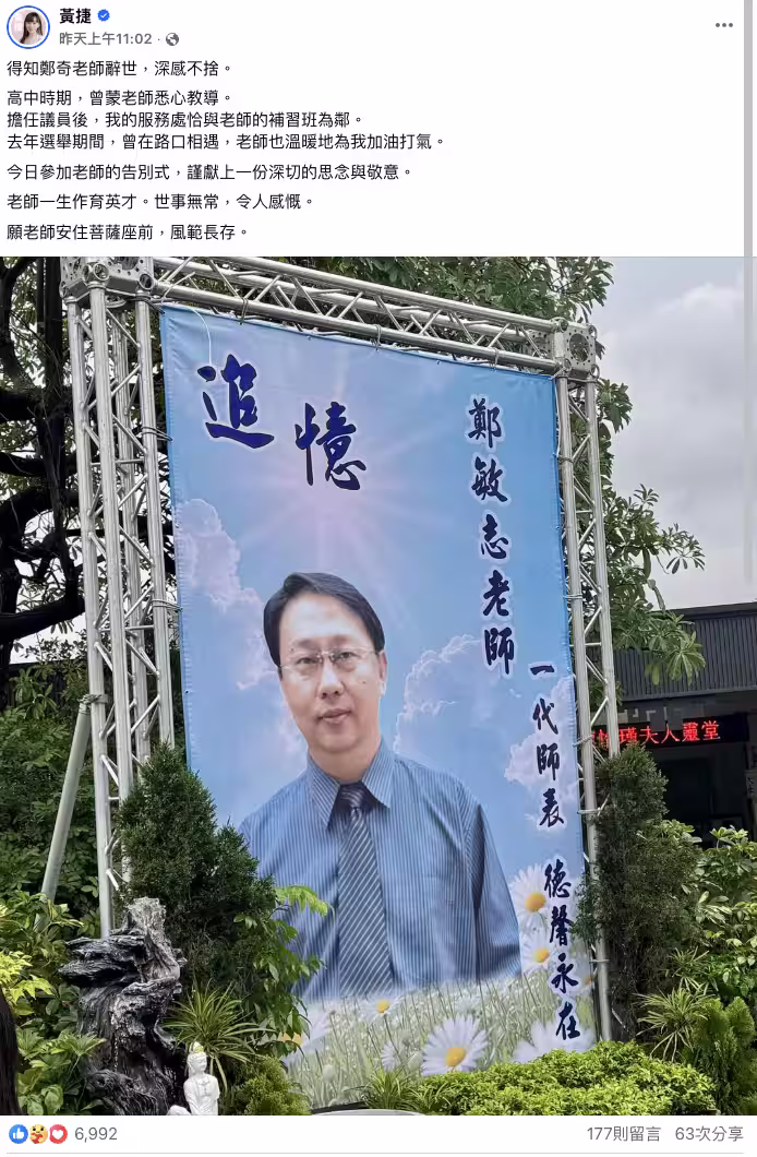 民進黨立法委員黃捷也是鄭老師的得意門生之一,當天也特地前來送別恩師。