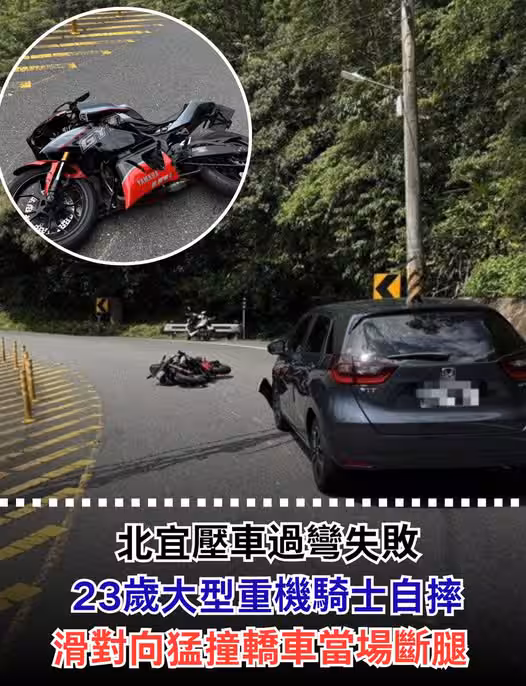 北宜壓車過彎失敗…23歲大型重機騎士自摔,滑對向猛撞轎車當場斷腿 !