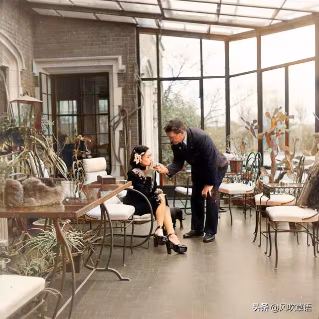 在玻璃暖房內,陳納德彎下腰給妻子點煙,這是洋人表達獻殷勤的一種方式。可以看到暖房的空間非常大,陳香梅穿著呢絨的旗袍和高跟鞋,鬢間插著一朵花。