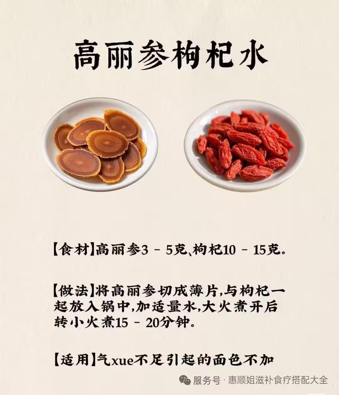 食材 :高麗參3—5克、枸杞10—15克。