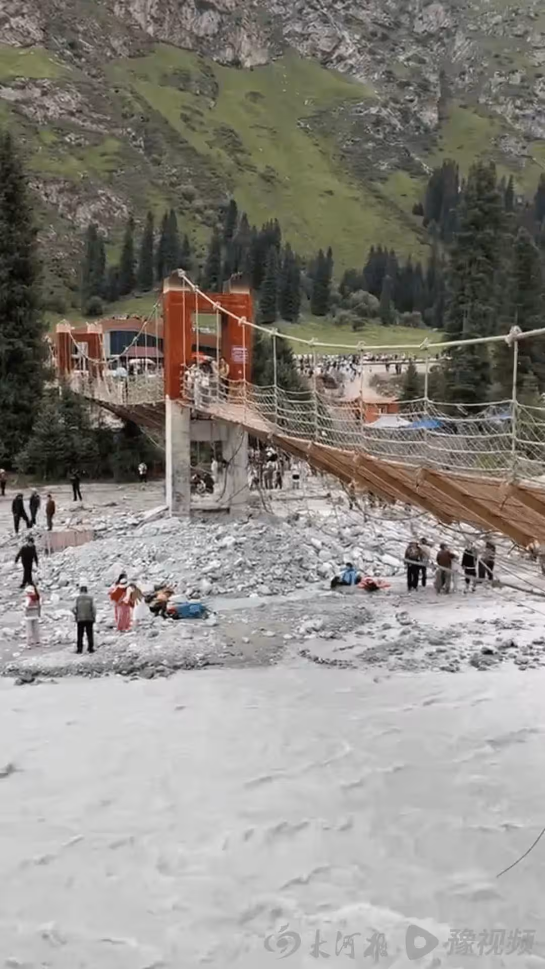 據大河報此前報道,8月6日,新疆伊犁州昭蘇縣夏塔旅遊風景區內,一座吊橋發生繩索斷裂,橋面傾斜,有部分遊客從橋上跌入湍急河流中。遊客拍攝的影片畫面顯示,該橋一側繩索斷開,橋面向斷繩一側傾斜,部分遊客被困橋上,部分遊客躺倒在碎石堆上,現場有直升機進行救援。