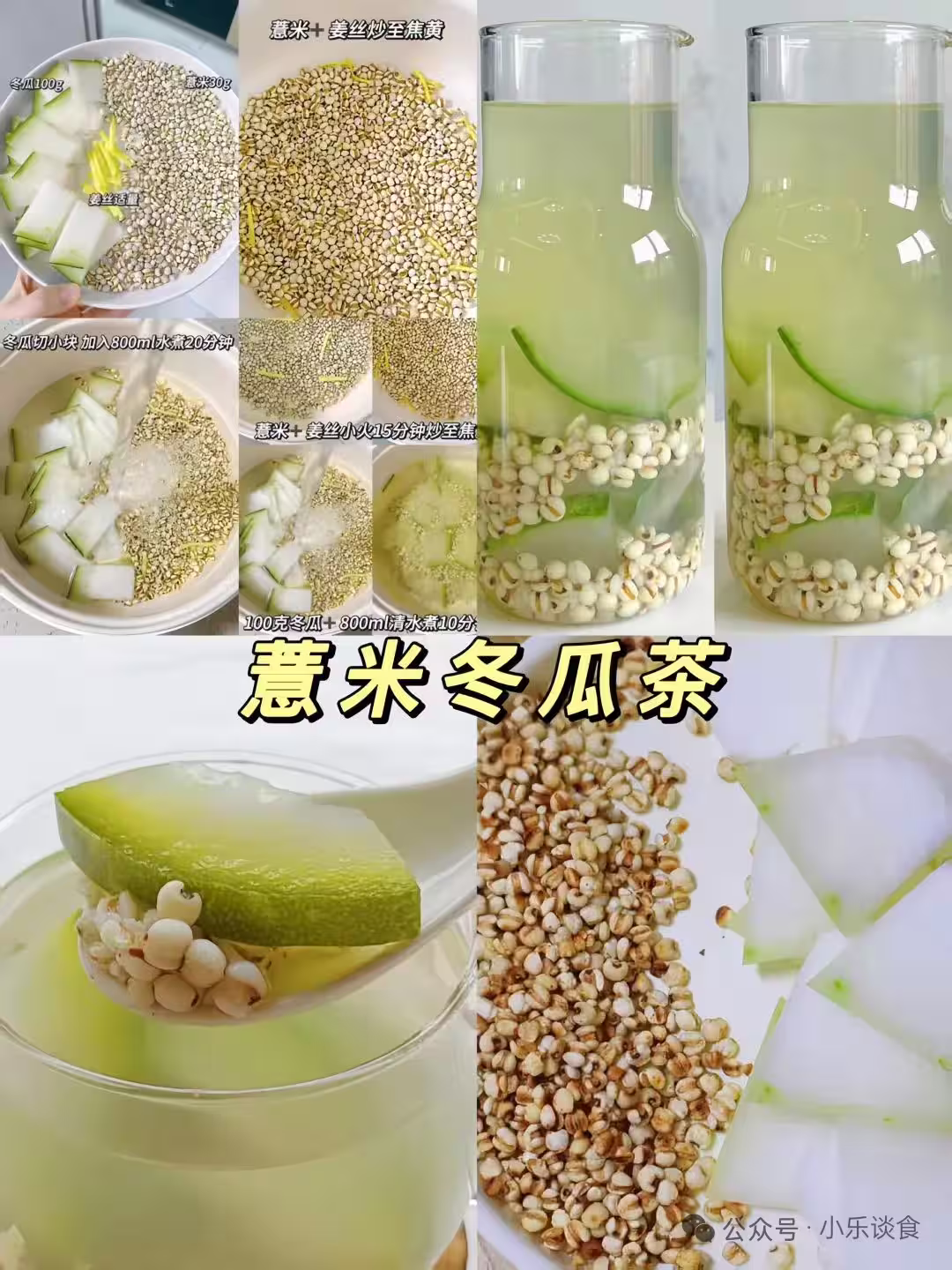 將薏米、薑絲小火炒至焦黃,冬瓜切小塊,和炒好的薏米加水煮,煮至有清香味即可!