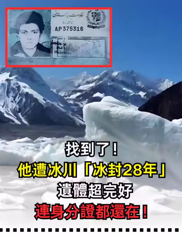 一名巴基斯坦男子在山區失蹤,28年前終於尋獲,原來他的遺體一直受到困冰川里的困擾,直到冰川融化才被找到,全身受損,不但衣服沒有被割破,就連身份證都還在口袋裡。