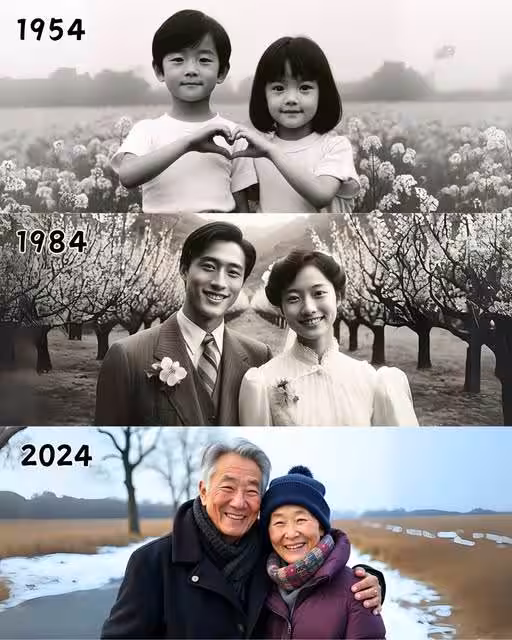 從童年的稚氣,到新婚時的浪漫,再到老年時的相互扶持,這組對比圖完整地展現了一段跨越70年的愛情故事。