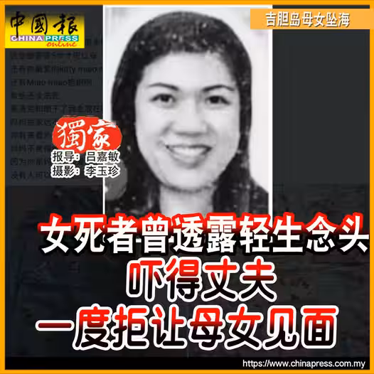 女死者為41歲華裔婦女林美蓮,她帶著年僅3歲的女兒離開位於莎阿南的住家後,前往吉膽島碼頭,最終一同墜海身亡。先生透露,妻子墜海前,曾攜女兒到老人院探望岳父,並讓對方抱抱孫女,妻子當時也向岳父透露尋死念頭。