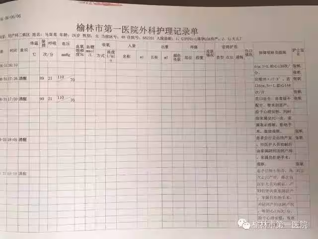 「情況已知,要求靜滴縮宮素催產,諒解意外」 在榆林市第一醫院外科護理記錄單上顯示,17時50分,產婦向醫護人員提出剖腹產的要求,醫護人員徵求家屬意見時,家屬稱表示理解,但拒絕手術,繼續觀察。