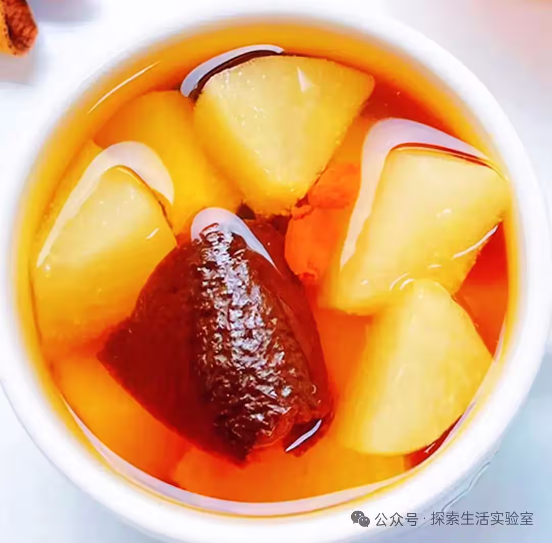 這梨片煮得軟軟的,帶著點陳皮的香,喝起來甜甜的但不齁,咽下去的時候喉嚨特別舒服。