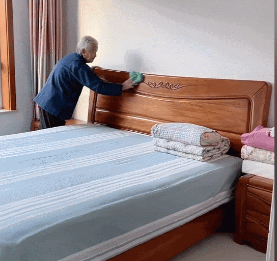 打掃完畢之後再用抹布擦拭床頭,每一個細小的地方都要擦拭一遍,她說這是每天必做的事情,也當成了一種鍛鍊身體的方式,看著乾淨的床鋪自己都開心。
