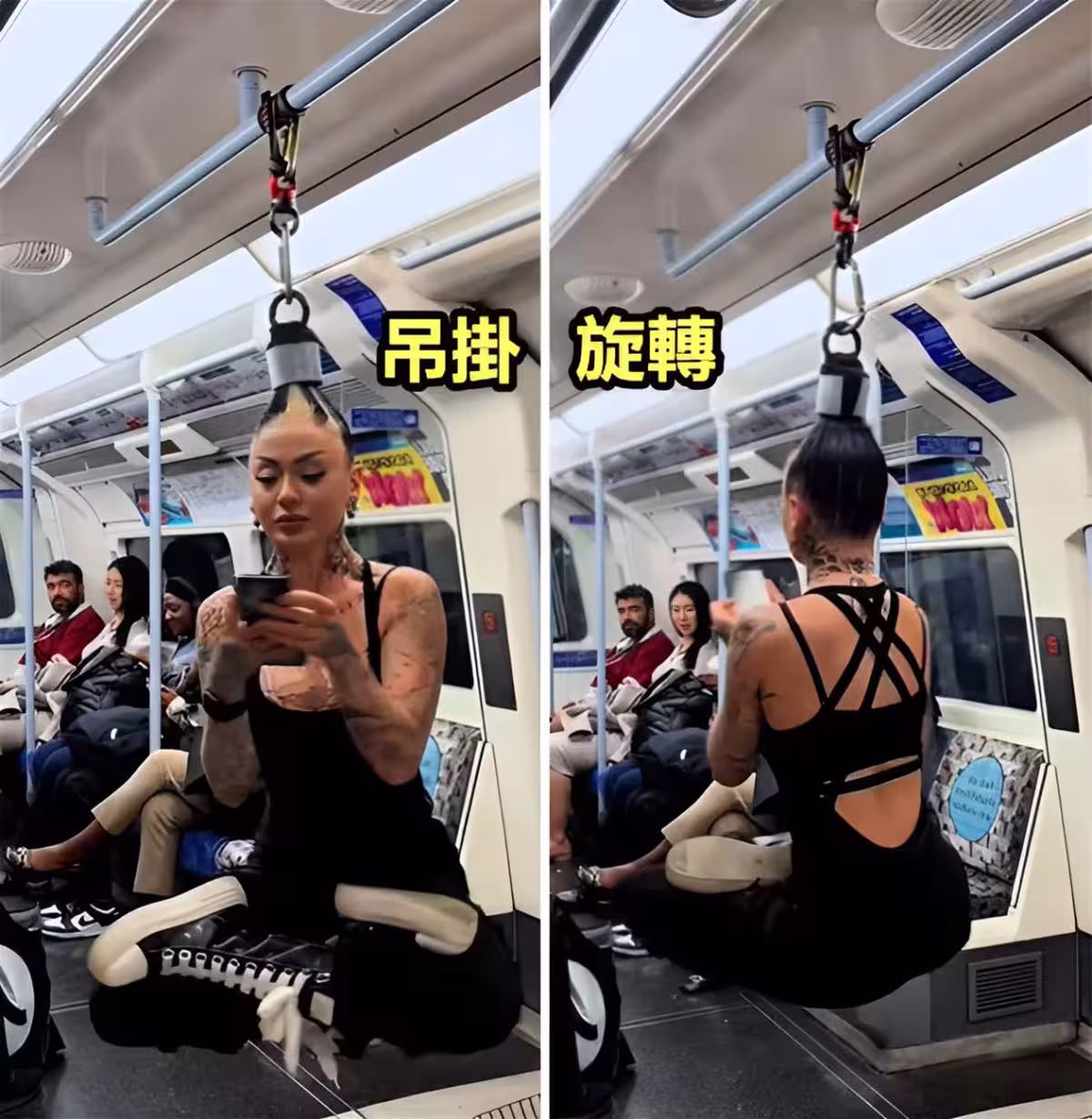 女子捷運上「盤腿吊空中」!輕鬆晃像在盪鞦韆 乘客全看傻 知情人急喊:快跑!她在練功捷運驚見女子「頭懸樑」盤腿懸空蕩鞦韆 真相曝光!最近網絡瘋傳一段捷運車廂內的離奇畫面:一名女子竟把頭髮「掛」在車廂的把手上,整個人盤腿坐在半空中,還悠哉地像盪鞦韆一樣輕晃,引發乘客側目。