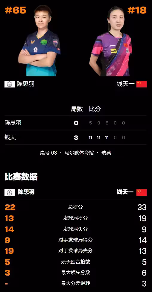 瑞典大滿貫:國乒開門紅!錢天一3一0橫掃對手,首戰大獲全勝