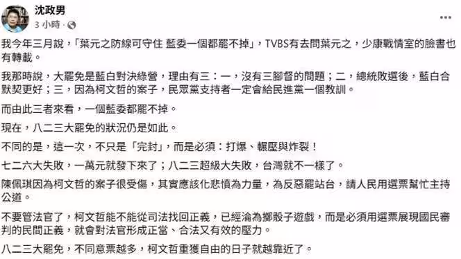台灣政治版圖面臨前所未有的挑戰,在7月26日的首輪大罷免中,國民黨立委及新竹市長以25:0完封綠營,宣告全新的政治局勢即將揭開序幕。隨著823第二波罷免的逼近,政論名醫沈政男強烈表示,此次罷免不僅需再度完封,更須打爆、輾壓與炸裂。他在社交媒體上直言,若823罷免再度失敗,台灣的政治環境將徹底改變。