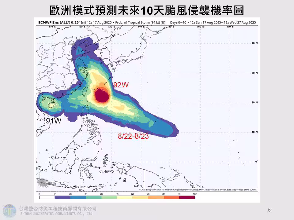賈新興指出,周五、周六在關島附近,可能有另一個熱帶性低氣壓發展的機率,預估往西北方向走,目前看往菲律賓呂宋島到巴士海峽附近的機率較高,「等時間近一點再觀察就好。」