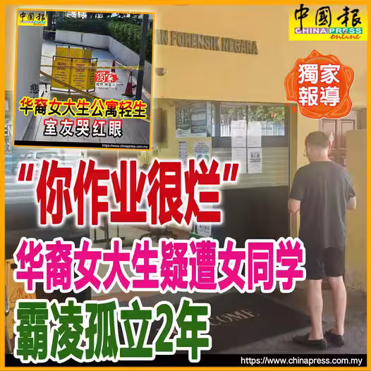 (吉隆坡20日訊/獨家報導)今日清晨從公寓22樓墜亡的華裔女大生,被指生前曾遭3名女同學言語霸凌、孤立、責罵做作業很爛等長達2年,同學甚至曾狠毒說出「不信你會跳」的話,最終女大生疑因不堪壓力,走上絕路!
