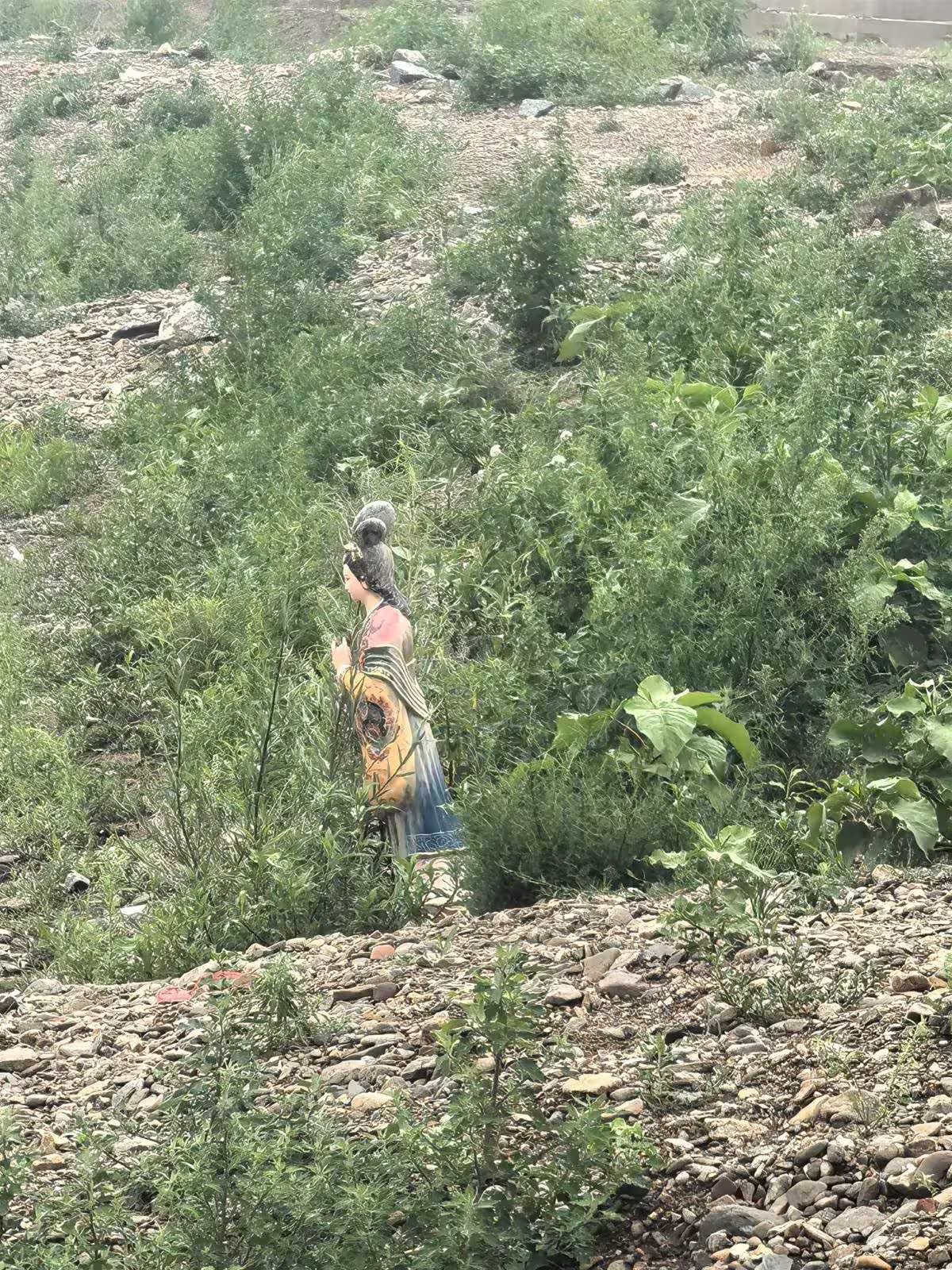 剛到河邊,我便被不遠處草叢中的一個模糊身影吸引住了。走近一看,才發現是一尊精緻的聖像。這尊聖像的面容栩栩如生,衣袂飄飄,仿佛帶著一絲神秘的氣質。然而,它身處的環境卻與它的神聖格格不入,周圍雜草叢生,顯得格外荒涼。