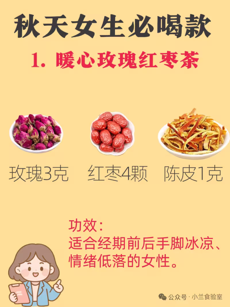 玫瑰花活血調經、舒緩焦慮;紅棗補氣生津;陳皮理氣化濕,專克秋季脾胃滯脹。尤其適合經期前後手腳冰涼、情緒低落的女性。
