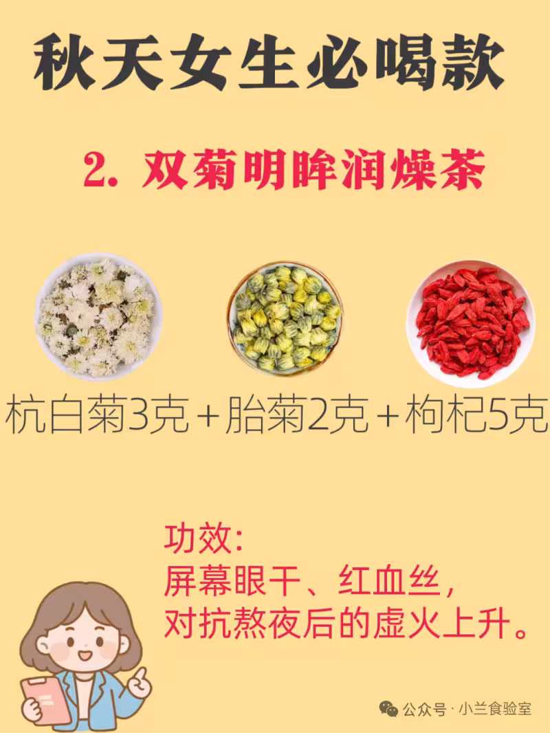 杭白菊清肺熱、胎菊平肝明目,搭配枸杞的β-胡蘿蔔素,緩解螢幕眼乾、紅血絲,對抗熬夜後的虛火上升。