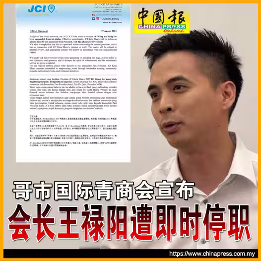 該文告昨晚發布在JCI Kota Bharu面子書專頁。根據文告聲明,鑒於近期情況,該會2025年度會長王祿陽醫生已被立即停職。即起由2024年度會長陳之謙全面代理領導職務。