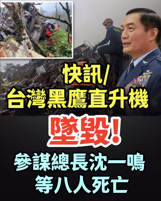 快訊/台灣黑鷹直升機墜毀,參謀總長沈一鳴等八人死亡~