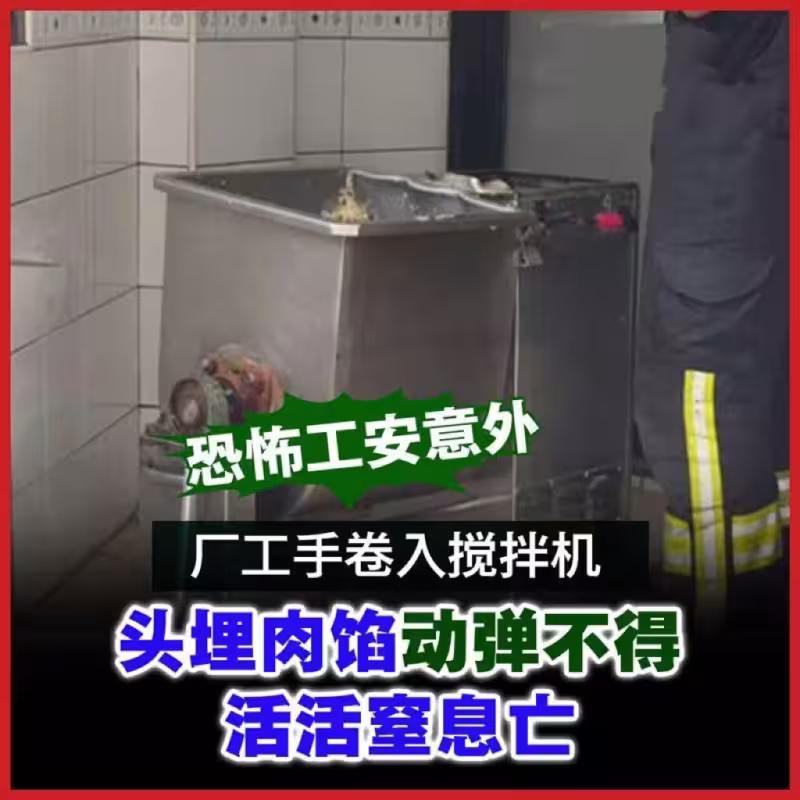 (台北綜合電)恐怖工安!台灣一名女廠工手臂被捲入攪拌機,頭部陷入肉餡中窒息身亡。