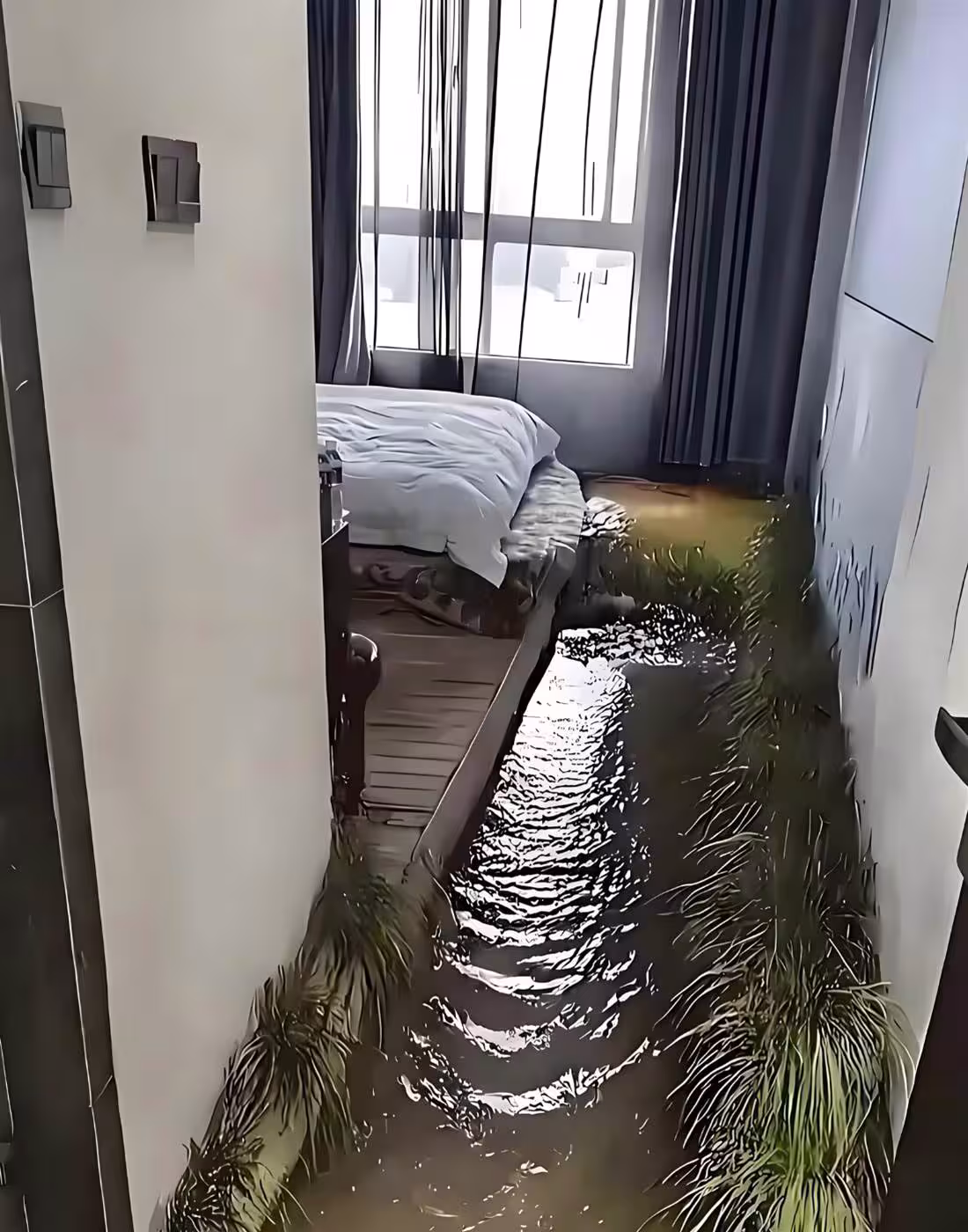 天花板上一盞暖黃射燈打下來,讓這片微型景觀看起來生機勃勃,但我整個人完全懵了。「兄弟……你……你這是裝修到一半沒錢鋪地板,還是打算半夜起來在屋裡釣魚?」我儘量讓語氣聽起來像開玩笑,但心裡OS是:這哥們兒壓力是不是太大,審美出了大問題?晚上起夜不怕踩進「河」里嗎?