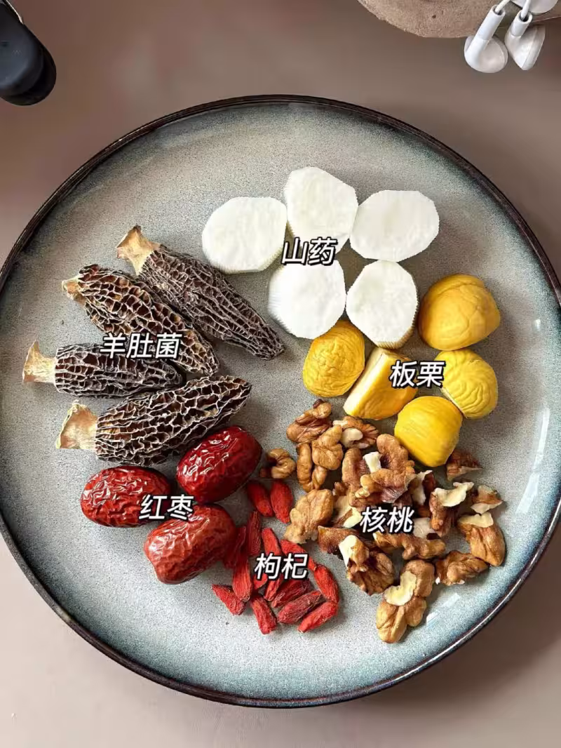 生板栗、生核桃、新鮮山藥、羊肚菌、紅棗、枸杞、排骨