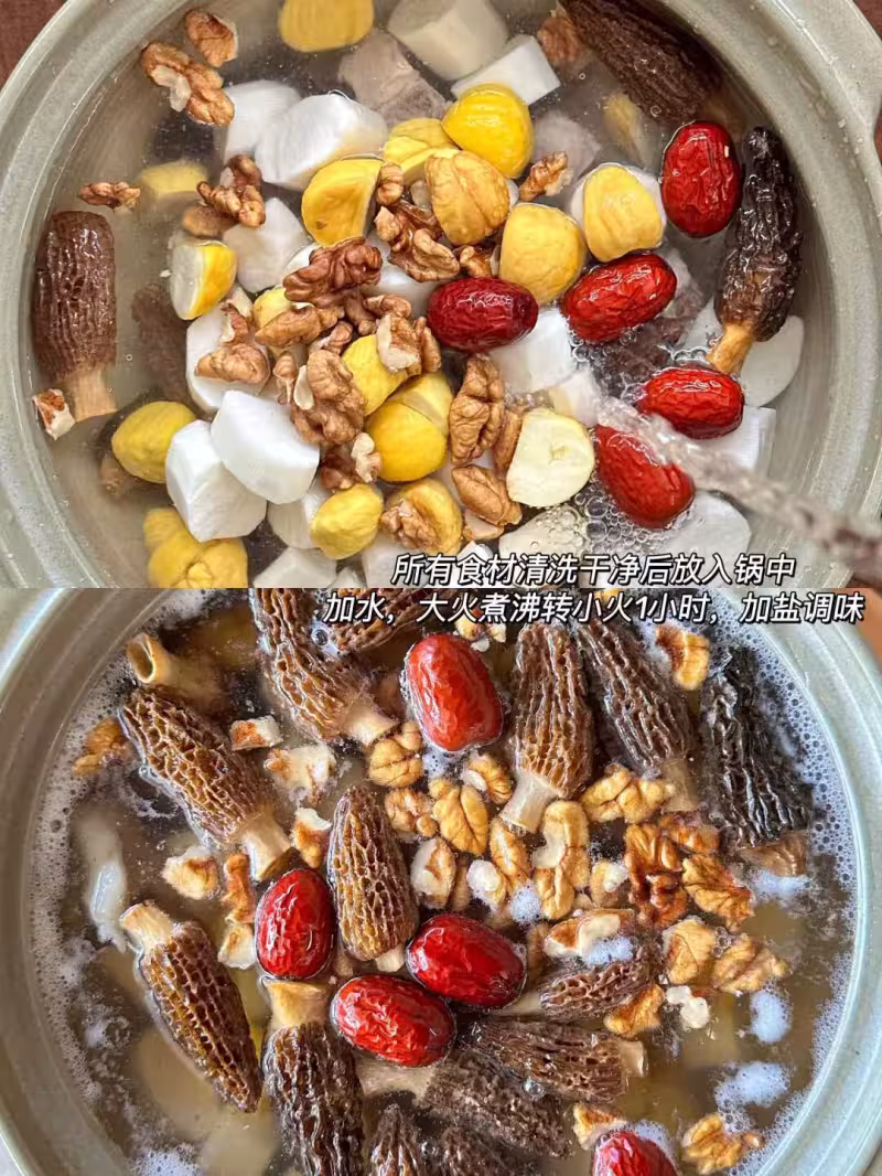 山藥能滋養五臟,栗子可補腎氣,核桃能補腎陽,枸杞則用於補腎陰,紅棗具有補中益氣的功效,羊肚菌可以健脾養胃。要是擔心湯品不好消化,還能加一片陳皮來理氣。