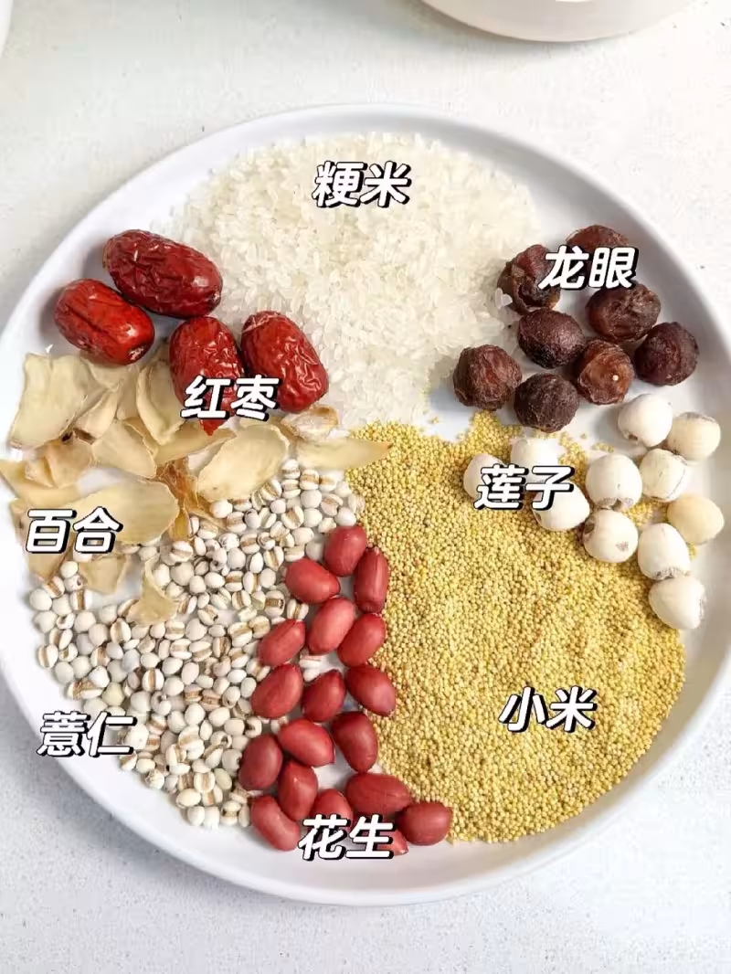 食材有小米、花生、紅棗,有時我也會加幾顆龍眼。把所有材料洗凈,直接倒入電飯煲,加水選擇煮粥功能。