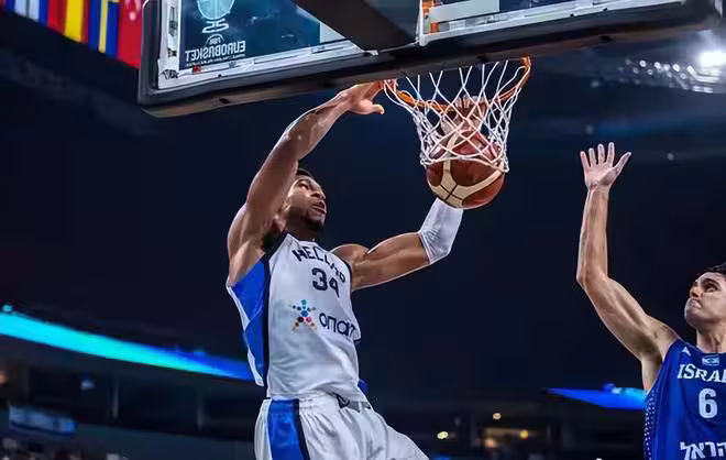 當時比賽最後以色列隊沒有放棄,他們只落後了6分還在強攻,結果字母哥上演精彩的連續防守回合。先是在時間還剩下14.5秒的時候,以色列隊強攻被字母哥送上一個單手的遮天大血帽,單臂把對手給摁了下來,這個球防完之後,接下來字母哥在時間來到12.7秒的時候,站在三秒區裡面又完成了一次協防。