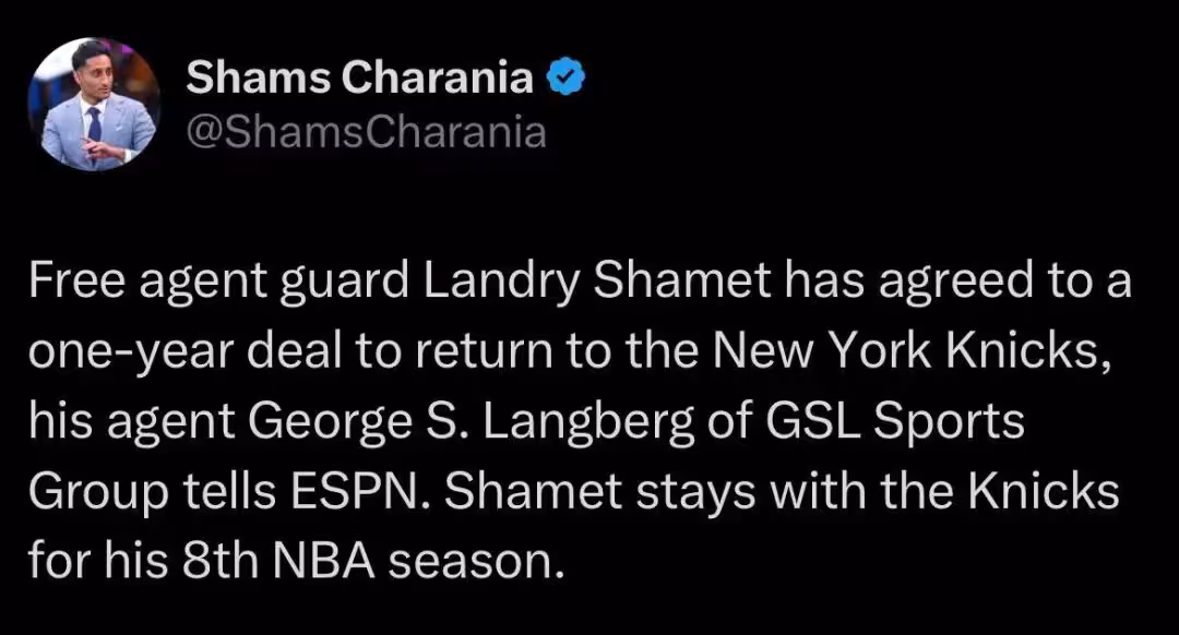 Shams:自由球員蘭德里-沙梅特同意以一年合同重返尼克斯。緊接著隊記Bondy補充報道,沙梅特簽下的是一份無保障合同。
