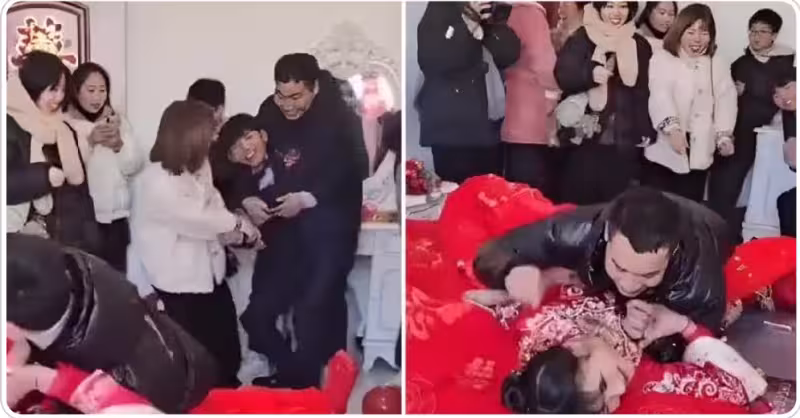 伴郎不顧他人目光,公然地趴在新娘身上,新郎則被其他人阻擋。