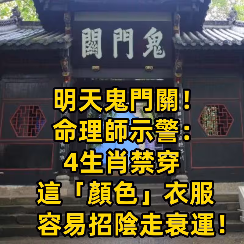 明天鬼門關!命理師示警:4生肖禁穿這「顏色」衣服,容易招陰走衰運! 農曆七月被稱為「鬼月」,尤其是鬼門開到鬼門關的這段期間,陰氣最重。 明天正逢鬼門關閉之日,傳統習俗里認為這一天是「好兄弟回歸」的重要時刻,陰陽交界能量最旺,若不小心觸犯禁忌,很可能會把霉運帶回家! 命理師提醒:有4個生肖,明天務必要注意自己的穿著,尤其是避免某些顏色衣服,否則容易惹來陰煞之氣,不但破壞好運,還會讓工作、財運、感情都卡關!