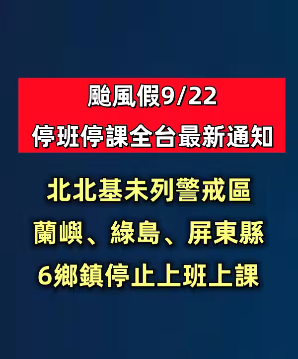 快訊/颱風假9/22停班停課全台最新通知 ,北北基未列警戒區 蘭嶼、綠島、屏東縣6鄉鎮停止上班上課!