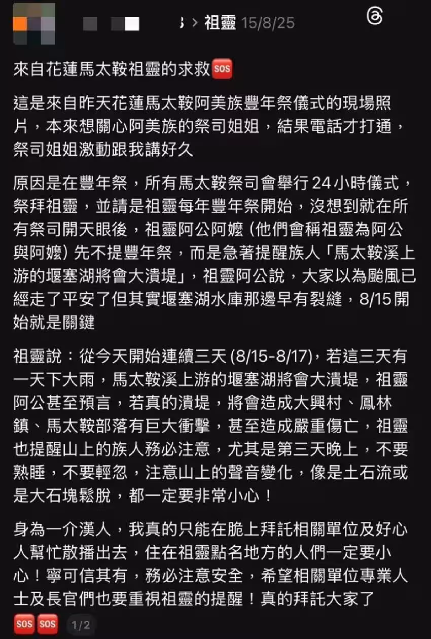 阿美族祭司8月祭典中的「祖靈警示」貼文如今被翻出,掀起網友高度關注。