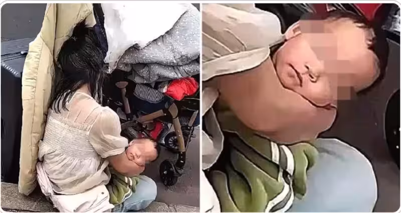 母親察覺到有人注視,猛地收緊手臂,眼神閃躲,眉毛得發白。