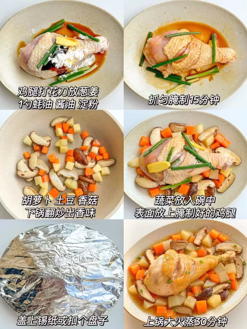4、蔬菜放入鍋中,表面放上腌好的雞腿