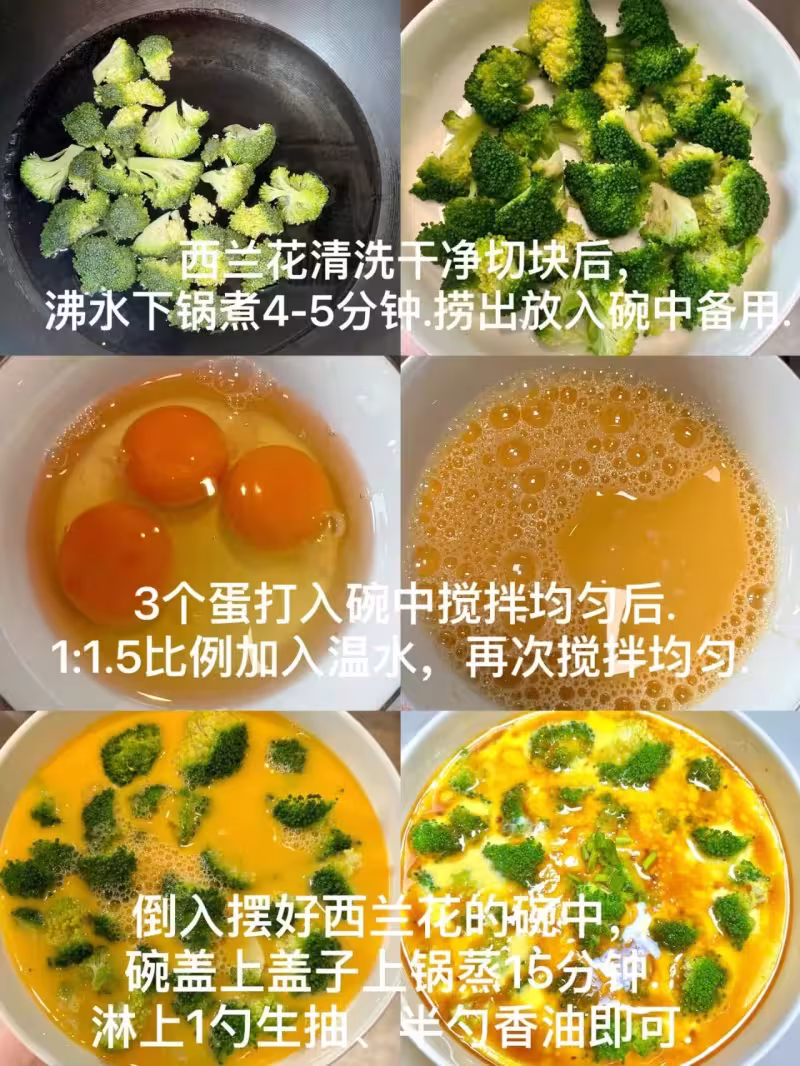 2、3個蛋打入碗中攪拌均勻後,1:1.5比例加入溫水!再次攪拌均勻,倒入擺好西蘭花的碗中!