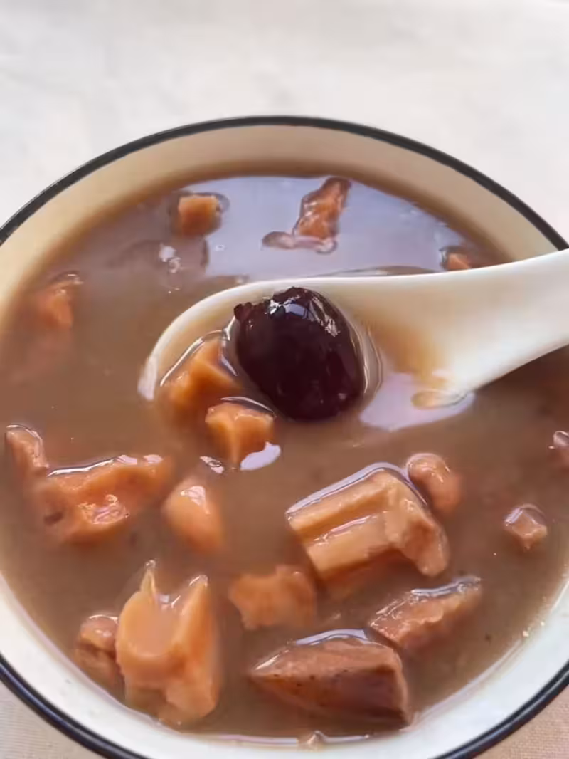 燉好的湯味道清甜,蓮藕軟糯,花生和紅棗也煮得爛爛的。我通常不加鹽,喝原味就很舒服。有時候晚飯不想吃太多,就直接喝一碗湯,再吃點湯里的料,肚子就飽了。
