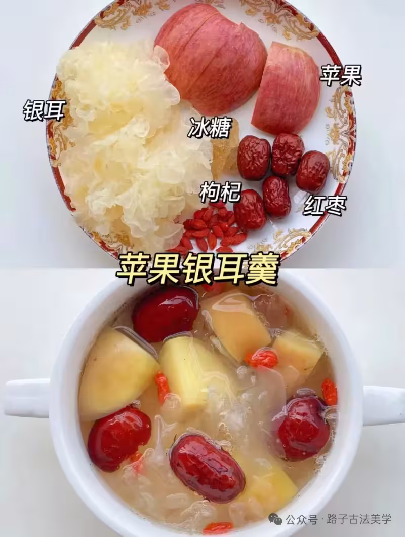 蘋果切塊,銀耳提前浸泡,紅棗去核,一起加水煮至約30分鐘,再加入冰糖、枸杞煮一會即可