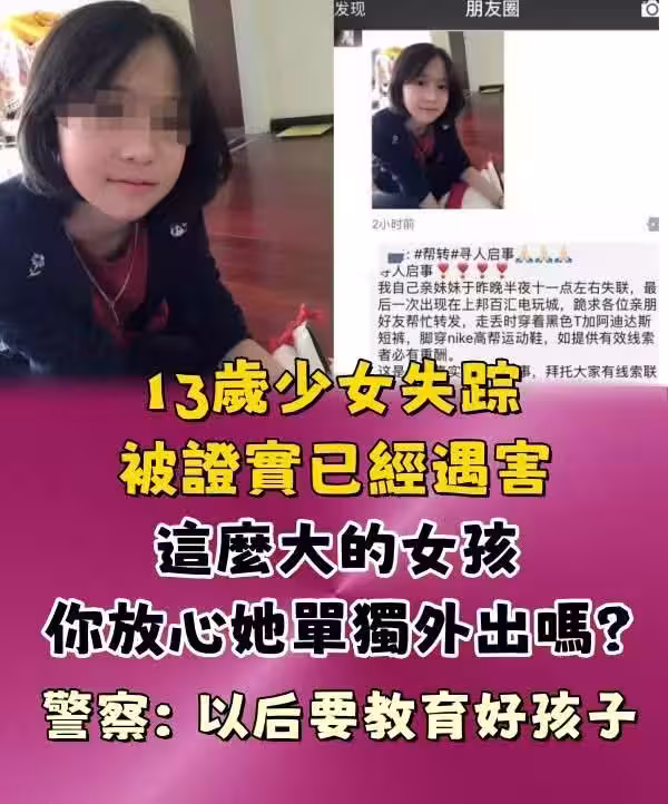 13歲少女失蹤被證實已經遇害,這麼大的女孩你放心她單獨外出嗎?警察: 以後要教育好孩子。