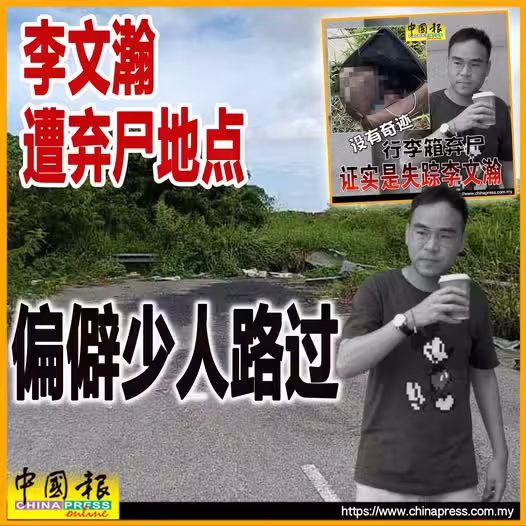 31歲保險從業員遭割喉藏行李袋棄屍案;死者李文瀚的棄屍地點位於北海令當安邦惹惹(Lintang Ampang Jajar)宗教保留地一帶,該路段位置偏僻,平日鮮少人路過。