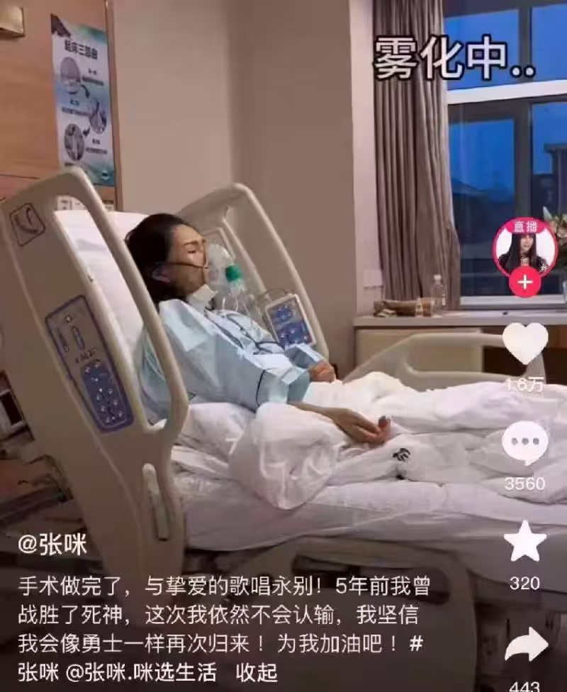 張咪錶示,自己現在特別難過,馬上要做手術,會切掉半個舌頭,到時候能不能清晰說話都成問題,唱歌更不敢想了。