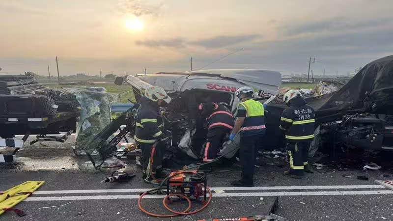 彰化聯結車猛撞停等紅燈大貨車! 車頭噴飛、駕駛受困救出